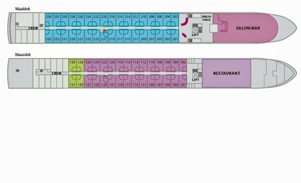 Het benedendek: Op het benedendek (Maasdek) vindt u het stijlvol ingerichte restaurant, waar u tijdens uw maaltijden via een groot tv-scherm het voorbijglijdende landschap kunt bewonderen.
