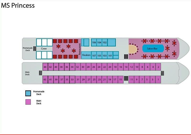 Het hotelschip: Nieuw in de vloot is het zeer charmante MS. Princess. Dit schip werd in 2000 geheel gerenoveerd en combineert hoogstaand comfort en knusheid op een unieke wijze. Het schip heeft een capaciteit van 100 passagiers in 50 hutten, verspreid over twee dekken. Of u nu aan de prachtige bar plaatsneemt in de lounge of in het gezellige restaurant met piano, u zult zich snel thuis voelen aan boord van dit schip.