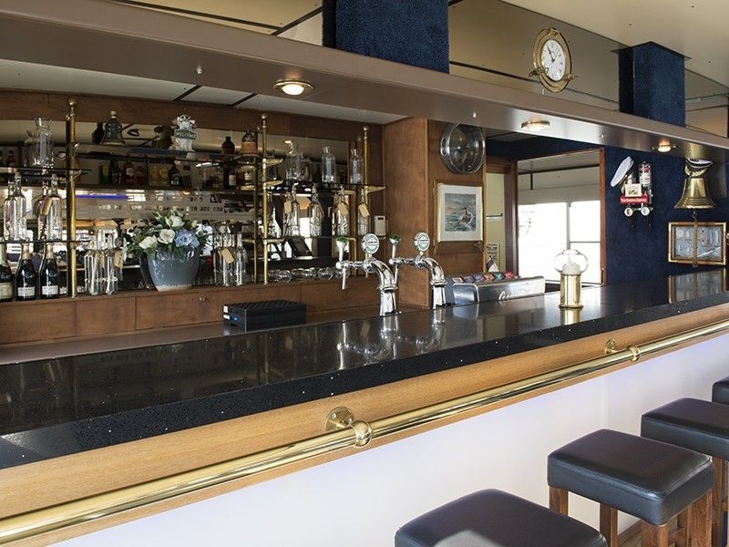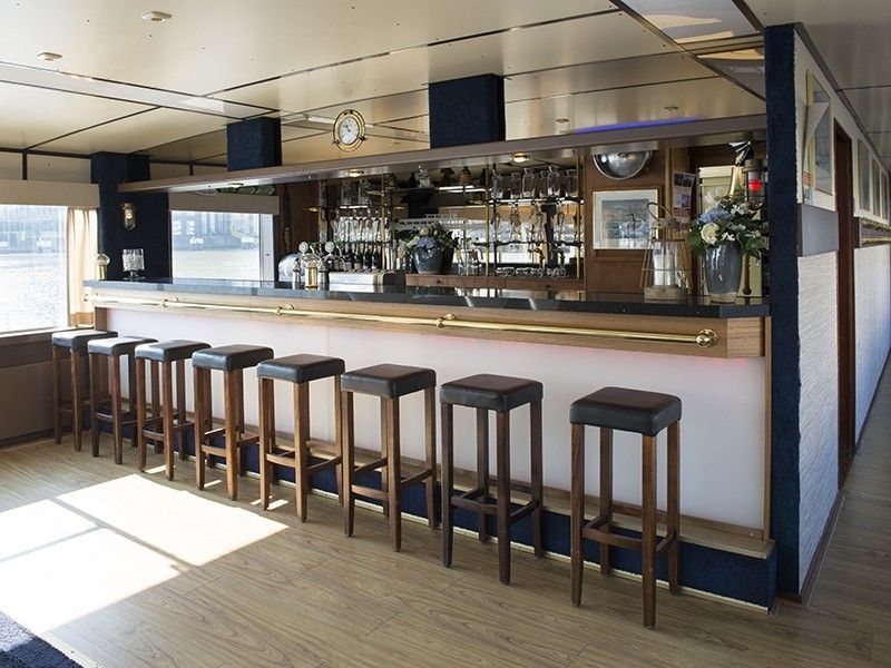 De benedensalon: de ruime benedensalon met bar is voorzien van los meubilair, zodat de salon per gelegenheid kan worden aangepast aan de situatie. Deze ruimte kan dus voor allerlei doeleinden gebruikt worden, zoals formele diners presentaties, maar ook voor swingende feestavonden: er ligt hier niet voor niets een grote dansvloer! En de bar is vlakbij…
